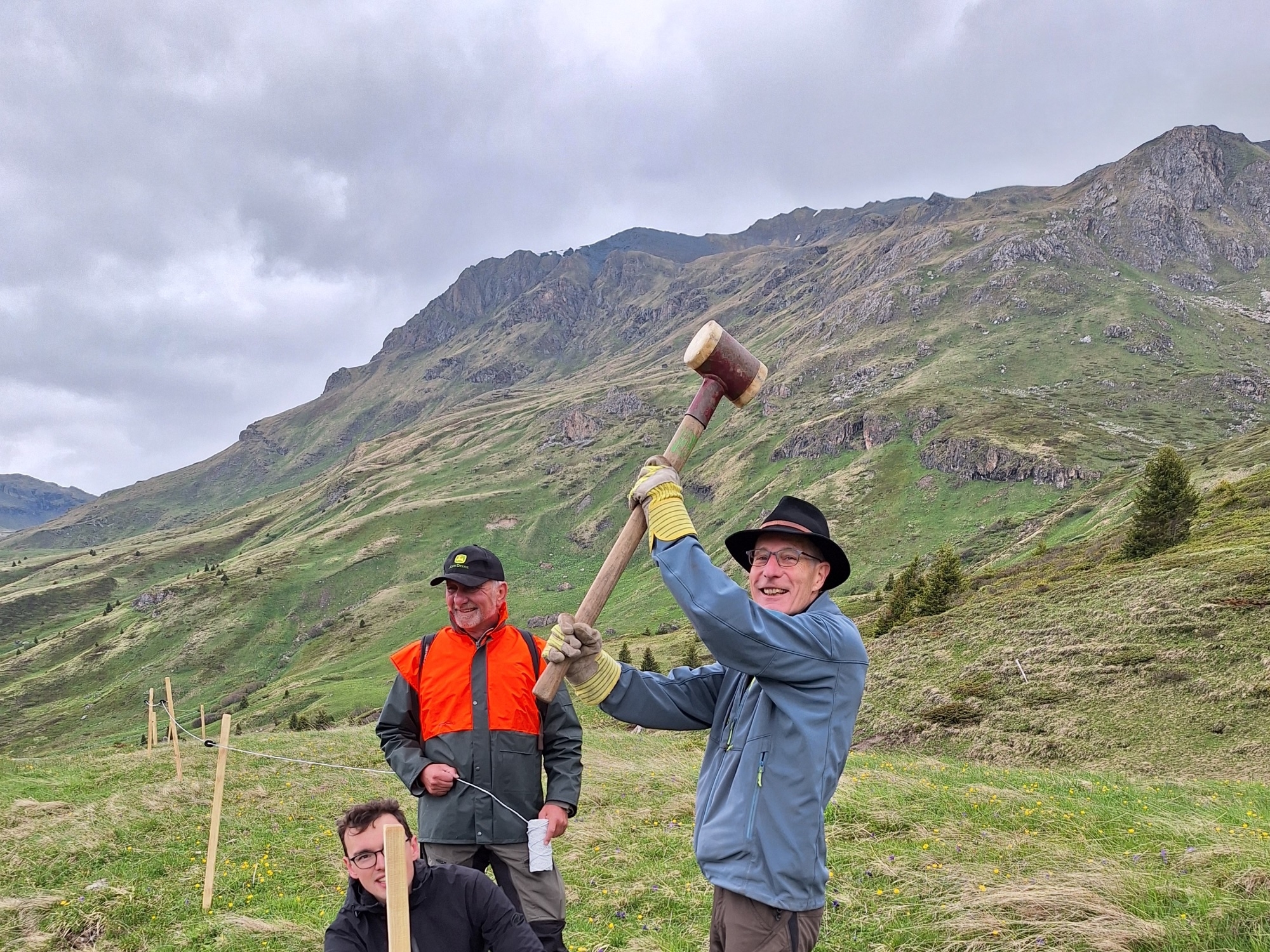 Nach einem Unwetter im letzten Sommer waren Instandstellungsarbeiten am Weidezaun oberhalb des Berggasthauses notwendig geworden. Unter Anleitung des Leiters der Alpgenossenschaft, Andreia Cotti, schlugen die tatkräftigen Helferinnen und Helfer vom RCaG Pfähle ein, montierten Weidezaun-Isolatoren und spannten den Draht.
